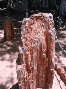 Broken part of a petrified tree, where the structure of the tree is visible. Source (Wikimedia Commons)