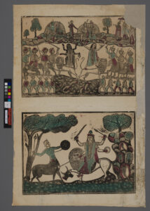 (Right) Goddesses Durga (as Jagaddhatri) and Kali fighting with the Demons, Battala Print, 1850’s.