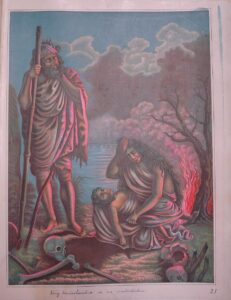 (Right) King Harishchandra at the cremation ground, with his wife and dead son. This was a symbolic depiction of ‘Bharat- Smashan’. The British Museum, 1885-1900.