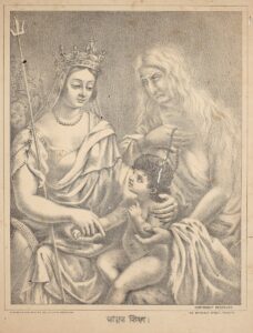 Yet the political imagery of the mother goddess was not without contradiction. Historian Sumit Sarkar shows how 19th-century bhadralok discourse often framed women within the home as either victims needing reform, paragons of threatened virtue, or symbols of capitulation to foreign ways. 9 The male patriot, in this rhetoric, was imagined as the ascetic figure holding together the shattered body of the nation. Strikingly, lithographs of a grief-stricken Shiva