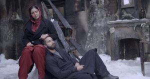 If you look closely and compare, now there is snow-covered ground, grey, desaturated colour palette. There are charred ruins behind them, Ghazala dressed in dark, heavy fabrics and Haider resting against her in exhaustion and grief. Winter drains all the colours from the frame, leaving only coldness, absence, and stillness—visual metaphors for the truth Haider uncovers and the emotional devastation that follows. In this scene, Haider seeks comfort, but the comfort is hollow; Ghazala offers warmth, but she herself is frozen with guilt and fear.
