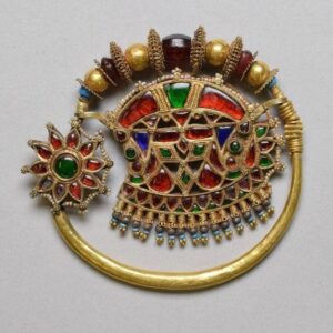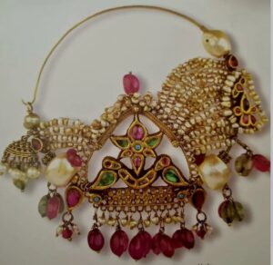 The above Nose ring, or Besar, from Himanchal Pradesh is a good combination of gold, turquoise, ruby or garnet, pearls and lac with silver wire. It is made through extensive wirework and granulation having a gold crescent-shaped fish design decorated with floral patterned granulation and a fringe of pearls and the stones are set on a bed of red lac within a gold wire bezel mounting. The Bulbul work, floral pearl, and use of turquoise and red stones increase the beauty of the ornament.