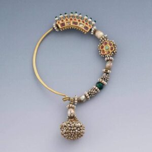 This Nath is from Madhya Pradesh having heavy wire decoration. “The lower part of the hoop is decorated with irregular pearls, a green tourmaline bead and a gold rousette set with glass beads” (Mathur and Chaturvedi, 2023). The gold-wired bunch of pearls at the end gives a beautiful touch to the nose ring.