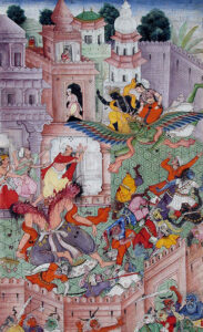 Krishna Cleaves the Demon Narakasura with His Discus. Razmnama, ca. 1585–1590, opaque watercolor and gold on paper, Mughal Court, New Delhi, India. Edwin Binney 3rd Collection. Wikimedia Commons, https://commons.wikimedia.org/wiki/File:Krishna_Cleaves_the_Demon_Narakasura_with_his_Discus.jpg. Accessed 11 October, 2025