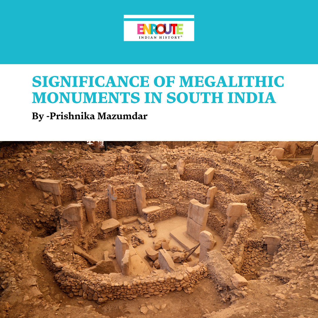 The megalithic culture in South India refers to an archaeological tradition that was characterised by the construction of large stone structures. This was mostly done for funerary purposes during the Iron Age (approximately 1200 to 200 BCE). Megalithic monuments are typically dated from 1200 BCE to 300 CE. These monuments are of different types. For example, dolmens are flat stone slabs laid over upright stones to form a burial chamber, cairn circles are piles of stones arranged in circular formations over graves, menhirs are tall, upright stones often placed alone or in rows, and urn burials consist of large pottery vessels used to contain the ashes or bones of the deceased. These are commonly found across Karnataka, Andhra Pradesh, Tamil Nadu, and Kerala. They were often accompanied by grave goods like iron tools, Black and Red Ware pottery, beads, and sometimes animal remains. This points towards a society that was settled and agro-pastoral and also one that was complex and socially stratified (Darsana, 2021; Rao & Marathe, 1989).