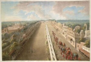 Watercolor representation of an idealised view of the Chandni Chowk from the top of the Lahore Gate of the Fort, with the Nahr-i Bahisht depicted running down the middle. Executed by Sita Ram. Circa 1814-15.