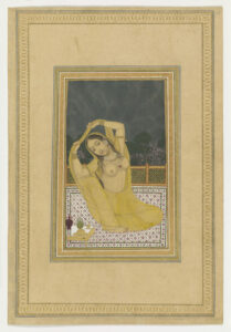 A night-time scene of a courtesan seated upon a terrace with a garden behind, late 18th century. Courtesy of Royal Collection Trust.