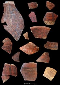 Trench 3, situated on the slope of Mound III, revealed six architectural levels, including stratified mudbrick buildings, domestic installations, and decorated ceramics consistent with the first Indus period. The presence of large quantities of fine painted pottery, along with craft debris, indicated a contemporaneous but possibly residential function in this part of the site, compared to the more industrial character of Trench 2 (Didier et al., 2017).