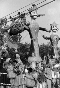 After the fall of the Mughal Empire, Ramlila performances gradually moved from the Yamuna banks behind the Red Fort to new public stages. The venue shifted first to Tees Hazari Bagh and later outside Ajmeri Gate, eventually settling at Ramlila Maidan. Industrialists, notably the Shri Ram family of Delhi Cloth Mills, sponsored productions, introducing innovations like revolving stages and spectacular aerial effects. One of the most memorable was Hanuman “flying” over the audience, suspended on wires, thrilling spectators as he swooped across the stage, embodying the epic’s grandeur and heroic drama. Committees formalised the organisation of performances, turning a once-spontaneous carnival into structured theatre.