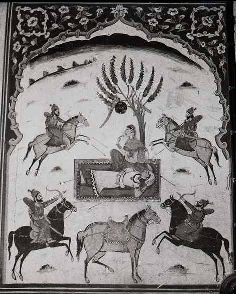 Photograph of a fresco illustrating Mirza being killed by Sahiba’s brothers (Mirza Sahiban folktale) at Palkiana Sahib near Tarn Taran, taken in 1971.